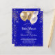 Ein königlich blauer Hintergrund. Dekoriert mit Imitaten vergoldeten Glitzer, Glitzern und Ballons. Personalisieren und fügen Sie einen Namen und Party Details hinzu. Der Name wird mit einem handgeschriebenen Stilskript geschrieben.