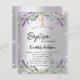 Eine moderne, stilvolle und glamouröse Einladung für eine Taufe, die ein kleines Mädchen feiert. Ein silbernes Imitat mit violettem Imitat Glitzer, Glitzern, Lavendelblumen, Blume und Eukalyptusgrün. Der Name ist mit einem modernen handgeschriebenen Stilskript geschrieben. Personalisieren Sie Ihre Daten und fügen Sie sie hinzu.