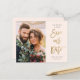 Ein modernes, sauberes Foto Ankündigung Datum freihalten mit Kalligraphie-Skript rette unsere Datums-Nachricht. Klicken Sie auf die Schaltfläche Bearbeiten, um dieses Design anzupassen.