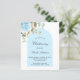 Weiß mit Eukalyptusgrün, hellblaue Rose, goldgelben Blätter und blauem Bogen. Personalisieren und die Kinder Name und Zeremonie Details. Elegantes handgeschriebenes Stilskript. Zurück: hellblauer Hintergrund.