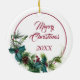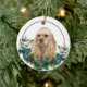 An der Vorderseite dieses Holiday-Ornament ist ein schönes Porträt eines bezaubernden, bärtigen amerikanischen Cocker Spaniel Hundes, der aus einem heiligen und immergrünen Teig herausschaut. Rote Beeren und Kiefernkonen schmücken die heiligen und kiefernroten Früchte. Das Bild wird auf einem weißen Kreis in einem dünnen roten Kreis platziert. Die Rückseite des Ornaments hat den gleichen immergrünen Kranz und Kreis mit Ihrem benutzerdefinierten Text in rot.