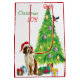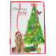 Auf jeder Seite dieser Holiday Geschenktasche trägt ein Stärkungszauber Cocker Spaniel eine Weihnachtsmannmütze, während er neben einem Holiday Baum sitzt. Rund um den Hund herum gibt es leicht gewickelte Geschenkpakete. Auf dem Weihnachtsbaum landet eine Stierfinke. Der rote und grüne Text sagt "Christmas JOY".