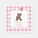 The teddy bear and balloon theme on the napkins allow for customization by adding a name above the "Baby Shower" text. The pink text sits inside a white square with pink border, while the background is an pink and white, buffalo check pattern.