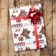 Das wiederholte Muster auf diesem niedlichen Weihnachtsverpackungspapier ist ein Bild eines schwarzen Labrador Retriever Hundes mit einer Weihnachtsmannmütze, mit einem schwarzen und roten Büffel karierten Kissen hinter ihm, und ein koordinierendes Geschenkpaket mit einem goldenen Band neben ihm. Es gibt auch einen Büffel kariert und den passenden Text, der "JOY" sagt. Stilisierter, roter und schwarzer Büffel karierter Text sagt MERRY CHRISTMAS", und Ihre eigene Unterschrift ist in zwei Bereichen für Sie individuell.