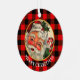 Im Mittelpunkt dieses Holiday-Ornaments steht ein Retro-Bild des traditionellen Weihnachtsmanns mit seiner roten Pelzkappe, rosigen Karos, blinkenden Augen und weißem Bart. Der Weihnachtsmann trägt einen Hauch von heiligen und roten Beeren auf seiner Kappe und hält einen rot-weiß gestreiften Bonbons. Der karierte Kreissegment "MERRY CHRISTMAS" steht ganz in Weiß. Die Rückseite hat das gleiche Bild und den gleichen Rahmen mit einem anderen Textfeld, das Sie anpassen können. Derzeit steht dort "GLÜCKLICHES NEUES JAHR", aber Sie können es leicht personalisieren.