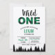 Wild One! Diese karierte Einladung ist für eine Geburtstagsfeier perfekt. Enthält das Muster des Karos und die Silhouette der Bäume in grün und schwarz. Ideal für ein Party im Herbst oder im Winter, einen Lumberjack, ein Abenteuer oder ein Outdoor-Thema oder einen Flanellkleid-up Bash.