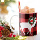 Dieses Urlaubsdesign zeichnet sich durch einen Büffel-karierten Hintergrund mit zwei weißen silhouetted Elch mit einem Weihnachtskranz auf den Geweihten aus. Wählen Sie aus der 11 oz oder 15 oz Keramik Tasse in einer Vielzahl von Stilen oder einem anderen Style Drink Ware, wo das Design passt.