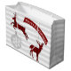 Weihnachtsgeschenk-Tasche aus Maskuline in einem hellgrauen und weiß gestreiften Hintergrund, mit roten und schwarzen Büffel karierte Hirschausschnitte, graue und weiße Schneeflocken und ein rot-weiße Banner las Fröhliche Weihnachten. Personalisieren Sie den Text, um zu lesen, was Sie gewollt haben.
