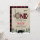 Niedlicher Winter, Büffel kariert oder lumberjack Thema erste Geburtstagseinladung für einen kleinen Jungen. Das Design ist mit einem Bären, Kiefern, Schnee und einem Büffel karierten Muster ausgestattet und wird dazu beitragen, die Szene für eine bevorstehende Lumberjack-Geburtstagsparty zu Set zu bringen.