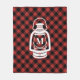 Eine Fleecedecke mit einem karierten Muster aus rotem und schwarzem Erbe (Büffel). Im Zentrum befindet sich eine Illustration einer Signalleuchte mit weißem Camping. Personalisieren Sie das Initial auf Laterne.