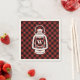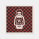 Napkins mit einem karierten Muster in Rot und Schwarz (Büffel) vorne. Im Zentrum befindet sich eine weiße Abbildung einer Öllampe aus Camping. Personalisieren Sie das Initial auf Laterne.