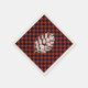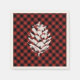 Napkins mit einem karierten Muster in Rot und Schwarz (Büffel) vorne. Das Zentrum zeigt eine weiße Abbildung eines Pinecons.