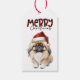 An der Vorderseite dieses Weihnachtsgeschenkschilds steht ein Bild eines bezaubernden Pekinger Hundes mit einem rot-weißen Hut aus dem Weihnachtsmann. Der Büffel-karierte Stiltext oben steht für "Frohe Weihnachten". Die Rückseite des Tags hat mehr stilisierten Text, der "JOY" und ein Büffel karierten Bogen, mit Textfeldern für Sie anpassen. Schauen Sie sich das passende Geschenkpapier in unserem Shop an.
