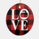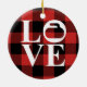 Weihnachtsschmuck mit LIEBE-Text und Curling-Rock auf rotem Büffel karierten Hintergrund. Ideal für Curler und Curling-Fans.