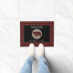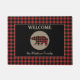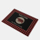 Ein Büffel mit karierter Silhouette steht im Zentrum eines Bräunungszirkels auf dieser attraktiven Türmatte. Der Kreis wird auf einem schwarzen Hintergrund platziert, der mit einem karierten Rahmen aus rotem und schwarzem Büffel gerahmt ist. Ihr eigener Text ist in der gleichen Farbe wie über und unter dem Kreis und trägt das Bild. Ideal für eine Hütte, Waldland Zuhause, aber auch komfortabel beim Zuhause in der Stadt!