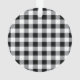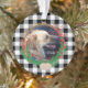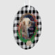 Ein rundes Acryl Weihnachtsgeschmack mit Ihrem Ein Hund Foto . und Name. Der Hintergrund ist ein klassischer, schwarz-weißer Buffalo Karo. Es gibt auch einen Kranz mit einigen Kiefern und roten Beeren vorne.
