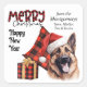 This Holiday sticker features a beautiful German Shepherd Dog wearing a red and white Santa hat. Behind the dog is a red and black buffalo plaid pillow, and a matching gift package sits beside it. Buffalo plaid typography pairs with black script to say "MERRY Christmas", with "Happy New Year" below that. Your custom signature is in two easy to change text fields. Perfect for your Holiday correspondence, or to decorate gift packages.