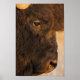 Nahes Foto eines Buffalo-Gesichts. Antelope Island Staat Park in Utah am frühen Morgen. Der blaue Morgenhimmel kann in seinem Auge reflektiert werden.