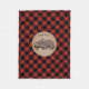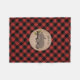 Eine Fleecedecke, die eine Illustration eines Bären stillsteht auf einer Baumniederlassung kennzeichnet. Hintergrund ist der schwarze und rote karierte Büffel. Personifizieren Sie den Namen.
