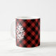 Eine Tasse, die ein rotes und schwarzes kennzeichnet kariertes Muster des Erbe (Büffel). Mitte kennzeichnet eine weiße Illustration eines pinecone.