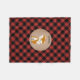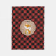 Eine Fleecedecke, die eine Illustration eines Fuchses kennzeichnet. Hintergrund ist der schwarze und rote karierte Büffel. Personifizieren Sie den Namen.