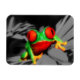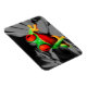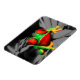 Foto eines hellen, glänzenden grünen Frosches mit einem roten Bauch, gelben, geflochtenen Fingern und riesigen roten, zwielichtigen Augen auf einem schwarz-weißen Hintergrund von Blätter.