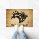 Personalisieren Sie diese einzigartige "One of a Kind" Bull Elk Door Mat! Es verfügt über eine majestätische Bugling Bull Elk Black Silhouette...auf einem Stresswald Hintergrund!