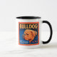 Ein Vintages Kratetikett, das einen Bulldog mit einem blauen gemusterten Hintergrund und einem orangefarbenen Rand illustriert. Wählen Sie diesen Kunstdruck auf Ihrem Zazzle-Produkt heute.