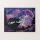 Genießen Sie dieses einzigartige "One of a Kind" Bull Elk Puzzle! Es verfügt über eine schwarze Silhouette eines Bullenelchs Stehend auf einem hohen Berg mit Blick auf einen prächtigen Mondlicht in einem Lila Blitzgesturm!! Original Grafik Design von Künstler Kerry Miller.