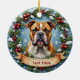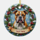 A beautiful, ultra-detailed Christmas ornament design featuring a realistic portrait of the breed centered within a soft, festive winter frame. This elegant design includes pine branches, red berries, and snowflakes against a snowy backdrop, illuminated by warm holiday lighting. The balanced, round composition includes clear space below the dog for customization.