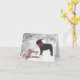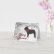Bulldogin Silhouette mit "Frohe Weihnachten!" Text auf Winterhintergrund.