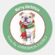 Ein Bild eines braunen und weißen Bulldog mit einem roten und grünen Winterschal steht im Mittelpunkt dieses Holiday Aufklebers. Das Bild ist in einem kreisrunden grünen Rahmen gerahmt, der den benutzerdefinierten Text in Weiß enthält. Niedlich für Weihnachtskarten, Korrespondenz und Geschenkpakete.