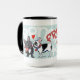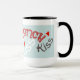 Niedliches Design für französische Liebhaber und Valentinstag! Schwarz-Weiß-Bulldog gibt einem schwarzen Franzosen einen großen schlampigen Kuss in dieser originalen Tinte und Bleistift-Illustration von Andie of Off-Leash Art.