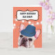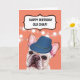 Eine lustige und humorvolle Illustration eines französischen Bulldoggen mit einer karierten Edelmütze hat eine Sprechblase über ihm, die liest, glücklich Geburtstagskorb! Und innen, haben einen blutigen guten Tag! Er ist von Imitaten gerahmt, die die Saitenleuchten und den orangefarbenen Hintergrund ausstrahlen. Ideal für Großväter; Väter; Onkel; Brüder und Ehemänner, die den britischen Spaß genießen.