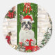 Französischer Bulldog Weihnachten sitzend draußen geschmückt Zuhause mit Weihnachtskranz, Weihnachtsbaum ist eine perfekte Weihnachtsgeschenk Idee für Hundefreunde.