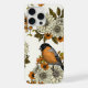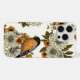 Hand -drawn illustration of a bullfinch bird on bouquet of dahlia, chrysanthemum, berries and branch of autumn leaves.
