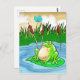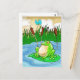 Postkarte, die den Bullenfrosch des Cartoon darstellt, der eine Libelle sieht. Illustration ©2019 Michael C. Paul https://mikepaulart.com
