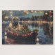 Set segelt mit dieser sehr detaillierten Abbildung in den Zauber der Urlaubssaison und zeigt einen stolzen Hund, der in einem festlich dekorierten Boot sitzt und über einen ruhigen Weihnachtssee gleitet. Die Lichter der nahen Kiefernbäume reflektieren das Wasser und warmen, festlichen Glanz, der das gemütliche Ambiente verstärkt. Die Ornamente versetzen sich von den Seiten des Bootes, während die Laternen leuchten und eine Szene schaffen, die das wahre Wesen der Weihnachtswärme und -freude einfängt. Dieses nostalgische Kunstwerk bringt eine Touch von Urlaubsmagie in jeden Raum, perfekt für diejenigen, die den Geist der Saison schätzen.