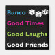 Hier ist ein buntes Grafik-Design, das Würfel und die Worte zeigt: Bunco, Good Times, Good Laughs und Good Friends. Fügen Sie Ihren eigenen Gruppennamen, das Datum oder eine andere Personalisierung hinzu. Gutes Hostess Geschenk oder Preis für Ihr nächstes Bunco Party.