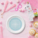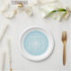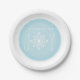 Der Babyduschen-Papier-Teller, der eine Illustration einer Schneeflocke kennzeichnet, inkorporierte in die Phrase, "Bündel Freude." Hintergrund ist blau.