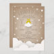 Eine Babydusche-Einladung mit einer Illustration eines gelben Bundles umgeben von Wolken und Sternen.