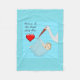 Ein Storch, der eine Babyblüte auf der blauen Decke zu seiner neuen Familie trägt, Welcome To This World Baby Boy. Ein rotes Herz symbolisiert die Freude und Freude in Bunble der Freude, die dieses Baby in diese Welt bringen wird.