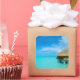 Souveniraufkleber eines Hochzeitsbungalows in einem Luxusresort in der klaren blauen Lagune der pazifischen Insel Bora Bora, in der Nähe von Tahiti im Archipel Französisch-Polynesien.