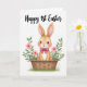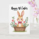 This card shows a young, rabbit-like character in soft caramel tones, with lightly textured fur and long ears showing rosy inner details 🐰. The little figure sits snugly in a sturdy wicker basket, gazing out with dark, curious eyes, gently flushed cheeks, and a small smile that feels like it’s meant for someone close. A vivid pink bow at the neck adds a sweet, affectionate touch, like a thoughtful gift between friends. The basket rests on a low strip of green grass, giving the scene a simple outdoor setting. Around the basket, sprays of fresh green leaves and blush-pink blossoms suggest early spring, with a tender, just-picked look 🌷. Across the open white background, the words “Happy 1st Easter” appear in large, flowing lettering near the top, standing out clearly in a dark ink. The petals and greenery frame the basket on both sides, with the brightest pink accents echoing the bow at the center.