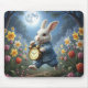 A white rabbit in blue pajamas hops through a vibrant flower garden, holding a retro alarm clock as the full moon illuminates the whimsical scene, creating a magical atmosphere
