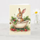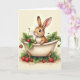 This design shows a young long-eared bunny 🐰 curled calmly inside a small cream-colored tub, its warm brown fur and bright white chest softly contrasting in the gentle light. Big dark eyes with fine lashes look slightly upward, giving the scene a tender, friendly mood, as if it’s quietly sharing a sweet moment with whoever is holding the card. The tub has carved claw-like feet in a golden-brown tone, adding a cozy, old-fashioned detail. Around the tub, leafy green berry vines spill over the rim and gather at the base, creating a snug little garden setting. Plump ruby-red berries dot the leaves like tiny accents, drawing your eye back toward the bunny’s rosy nose and perked ears 🐇. Any greeting text sits near the top in a warm brown color, with a smaller line placed near the bottom in a softer green to match the foliage. The leaves curl inward along the edges, and clusters of red berries peek out beside the tub’s curved rim.