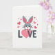This greeting card shows a cute gray bunny sitting on top of a large pink heart, with pink inner ears and rosy cheeks. The bunny has wide eyes and a happy face, and it wears a small pink bow with a tiny red flower on one ear, plus another little flower near its chest. Across the middle, the card spells out “LOVE” in dark gray letters, and the pink heart acts as the “O.” The background is white with soft shadows that make the bunny, letters, and heart look slightly layered. Small pink hearts and tiny red dots are scattered around like confetti, filling the space with a sweet, loving feel 💘. The simple pink and gray colors keep the focus on the bunny and the message, making it easy to read and enjoy ❤️. It’s a sweet pick for a partner, friend, or anyone you want to make smile 😘.