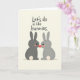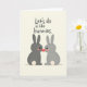 This greeting card features two rounded, human-like rabbits facing each other closely on a creamy background, their noses nearly meeting in a tender, teasing moment 🐰. One rabbit is a deep charcoal gray and the other is a soft dove gray, and both have small black eyes with rosy blush on their cheeks that reads like flirty shyness. Their long upright ears mirror each other, shaping a balanced scene that feels like a quiet date. A bright red heart floats between their muzzles, drawing your eye to the affectionate space they share. Each rabbit has a small white puff tail with a gentle textured look, adding softness to their simple forms. Centered near the top, dark handwritten-style lettering displays the phrase “Let’s do it like bunnies,” standing out clearly against the light background 🐇. Soft shadows sit beneath their bodies, and the red heart hovers sharply between their faces.
