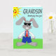 This greeting card features an upright gray bunny 🐰 centered on a strip of green grass beneath a bright blue sky, giving the scene an easy, sunny feel. The bunny wears dark rectangular glasses, a white shirt, blue overalls with yellow buttons, and a red tie, and its big front teeth add a friendly, slightly bashful charm. A smiling yellow sun with radiating rays sits near the upper left, as if beaming down on the bunny like a cheerful companion. Near the top, the main line of text is set large and easy to read, with the pun phrase “Somebunny loves you!” placed prominently across the upper area in a dark, high-contrast color. The bunny’s upright pose and neat outfit suggest it dressed up just to impress someone special 🐇. Simple shapes and solid areas of color keep the focus on the tender, lighthearted mood between the viewer and the bunny’s affectionate message. The background stays uncluttered, with the sun’s rays fanning outward and the green grass forming a single band along the bottom edge.