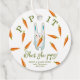 "Pop es. Wenn sie Pop!" Geschlechtsneutrale Babydusche Mit dem Sprichwort "A LITTLE BUNNY IS ON THE WAY!", eine Illustration eines Aquarellhasen (Kaninchen) mit Karotten in Pfoten und vielen orangefarbenen Karotten. Matching-Elemente verfügbar.